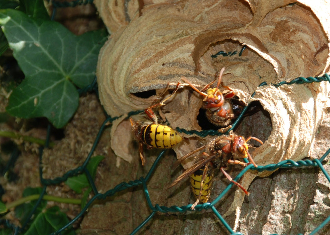 28.08.2017 In benachbarten Grundstücken haben Hornissen ein Vogelhäuschen zum Hauptnestbau und einen hohlen Baumstamm zum Filialnest ausgebaut