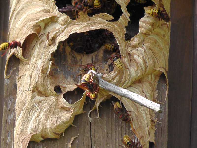 28.08.2017 In benachbarten Grundstücken haben Hornissen ein Vogelhäuschen zum Hauptnestbau und einen hohlen Baumstamm zum Filialnest ausgebaut