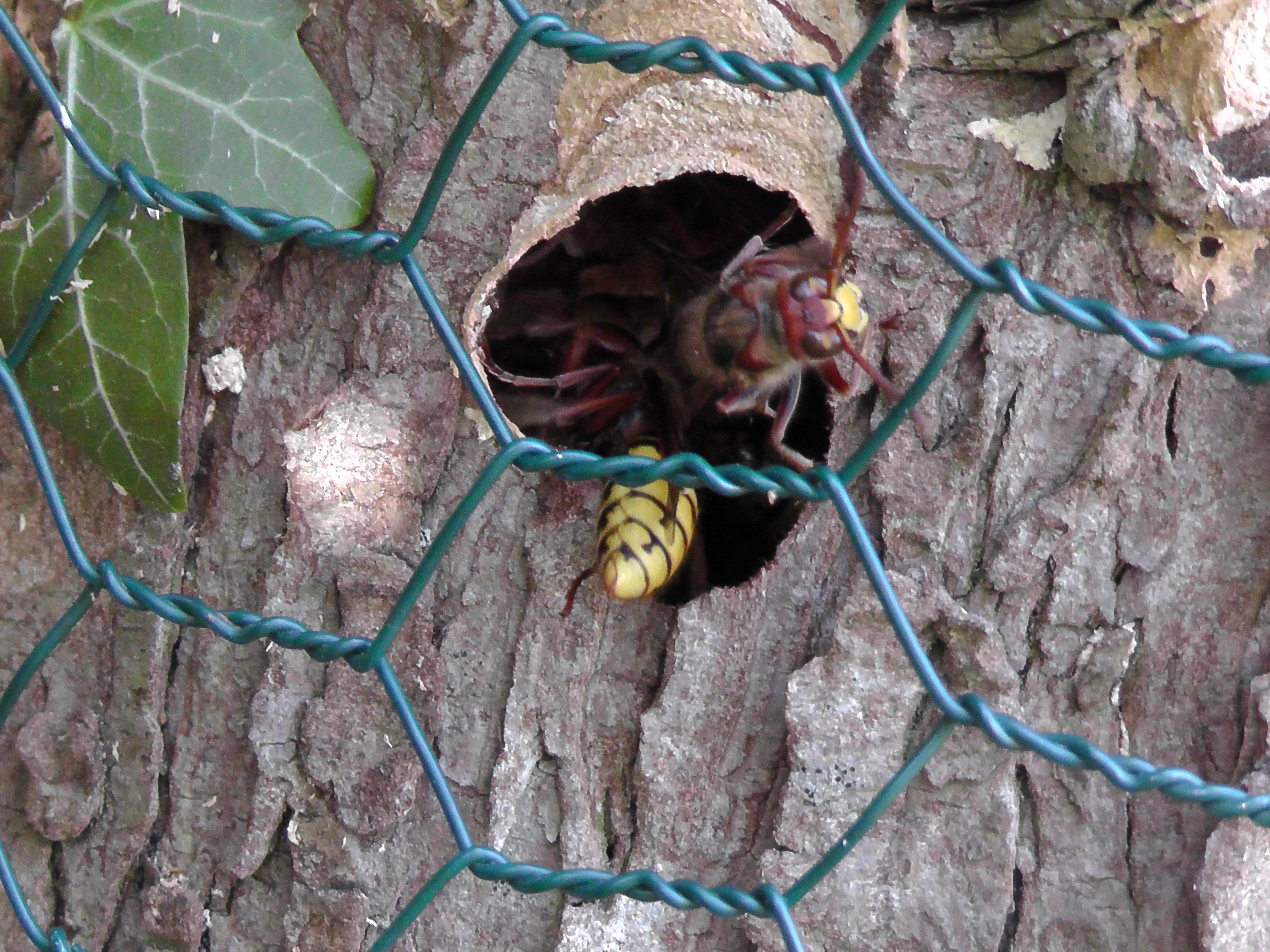 28.08.2017 In benachbarten Grundstücken haben Hornissen ein Vogelhäuschen zum Hauptnestbau und einen hohlen Baumstamm zum Filialnest ausgebaut