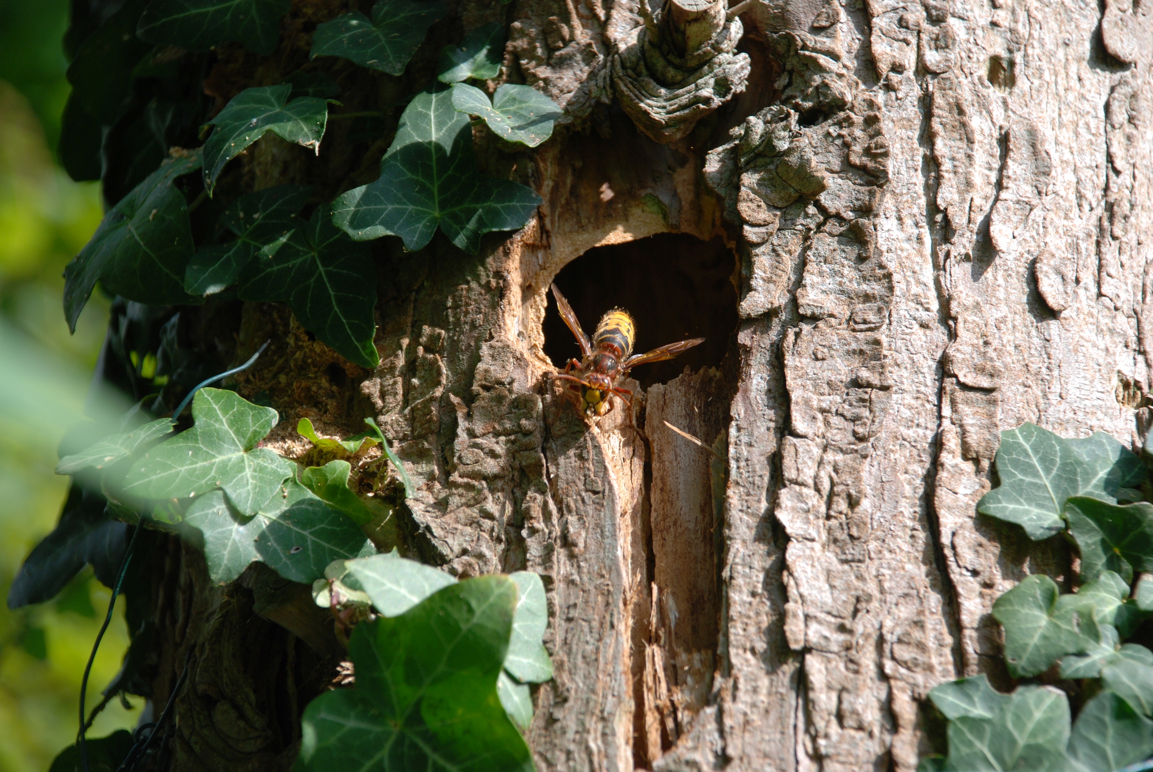 28.08.2017 In benachbarten Grundstücken haben Hornissen ein Vogelhäuschen zum Hauptnestbau und einen hohlen Baumstamm zum Filialnest ausgebaut